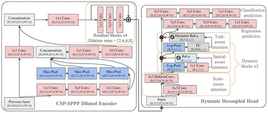 Detection head: The detection head is responsible for making high-quality predictions for both classification and localization, which can often be conflicting tasks. To resolve this issue, the decoupled head, as proposed in previous work, was introduced to enhance performance by using two parallel branches. Additionally, in a single image, multiple objects with vastly distinct scales, shapes, locations, viewpoints, and representations often co-exist, posing a challenge for the detection head to distinguish and address all these problems simultaneously. To tackle this challenge, we introduced a unified attention mechanism, called the dynamic head [35]. The detailed structure is illustrated on the right side of Figure 5. This mechanism formulates a unified head for maximizing its improvement and consists of three consecutive components: scale-aware attention, spatial-aware attention, and task-aware attention. The scale-aware attention helps learn the relative importance of semantic discrepancies to adaptively enhance the corresponding feature for an individual object based on its scale. Next, the spatial-aware attention focuses on discriminative regions consistently present across spatial locations. Finally, the task-aware attention is used to direct different feature channels to favor classification and box regression tasks separately. The regression branch predicts the localizations of bounding boxes in four margins deviated from the center point: left, top, right, and bottom distances.