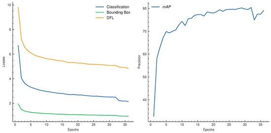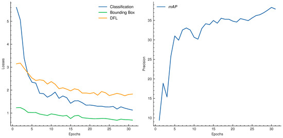 The loss items (left) and precision (right) curves of SPVDet during the fine-tuning process of the SPVD dataset, evolving over 30 epochs.