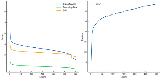The loss items (left) and precision (right) curves of SPVDet evolved along with the 300 epochs during the training process of MS COCO dataset.