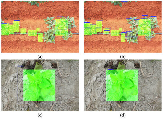 Qualitative results of SPVDet-Nano using FI (left column) and SAHI plus FI (right column) for ground and UAV high-resolution images in the field. The ground-truth annotations are marked in green masks and the model predictions are annotated with blue rectangles accompanied by prediction confidence scores. (a) FI, 5472 × 3648 from UAV camera; (b) SAHI + FI, 5472 × 3648 from UAV camera; (c) FI, 5472 × 3648 from ground camera; (d) SAHI + FI, 5472 × 3648 from ground camera.