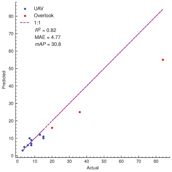 The scatter plot of counting performances of SPVDet coupled with SAHI technology on the test set of SPVD dataset under UAV view and overlook view. The linear regression metrics were used to evaluate the variance between predicted number of plants and ground-truth annotations per image.