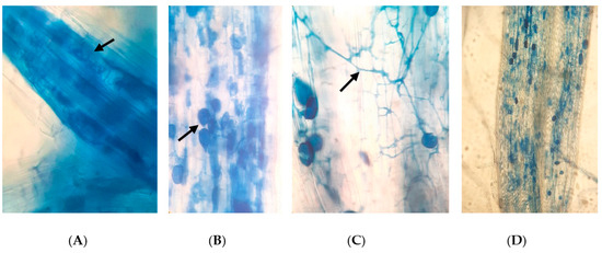 Different AMF structures observed in rice roots (blue in color, also shown in arrows) (×400): (A) arbuscules, (B) vesicles, (C) fungal hyphae; and (D) a highly colonized rice root (×100).