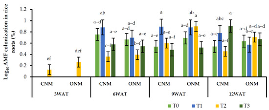 Effects of different treatments on rice root colonization. Means followed by the same letters are not significantly different (p < 0.05). T0: control; T1: AMF inoculation; T2: vetiver intercropping; T3: AMF + vetiver; CNM: conventional nutrient management; ONM: organic nutrient management; WAT: weeks after transplanting.