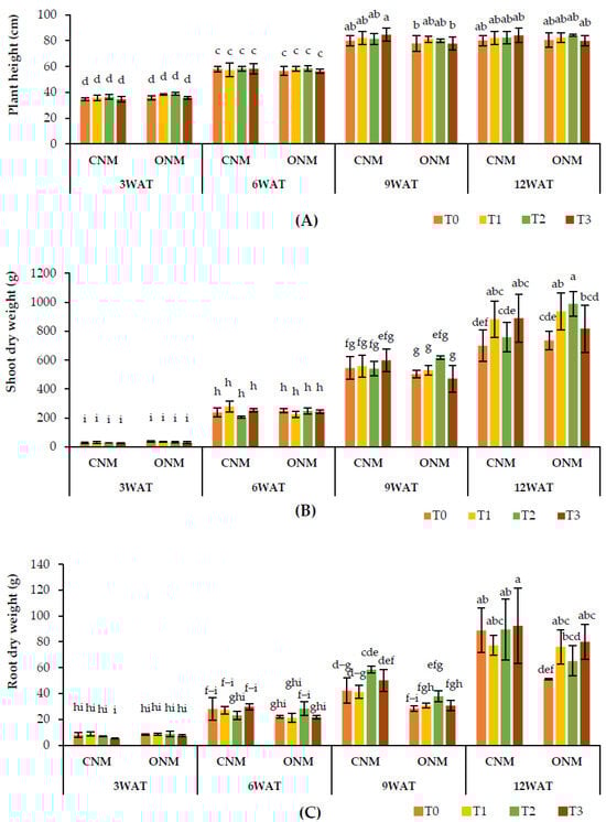 Effect of treatments on (A) plant height, (B) shoot dry weight, and (C) shoot dry weight at different growth stages of the rice plant. Means followed by the same letters are not significantly different (p < 0.05). T0: control; T1: AMF inoculation; T2: vetiver intercropping; T3: AMF + vetiver; CNM: conventional nutrient management; ONM: organic nutrient management; WAT: weeks after transplanting.