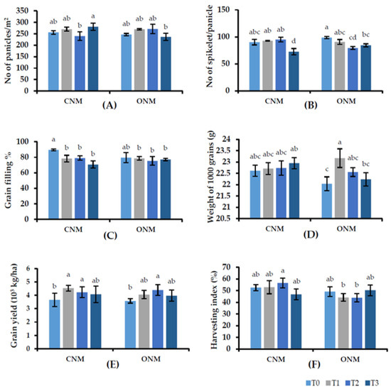 Effect of treatments on (A) panicles/m2, (B) spikelet/panicle, (C) grain filling percent, (D) 1000 grain weight, (E) grain yield (kg/ha), and (F) harvesting index with different nutrient management systems. Means followed by the same letters are not significantly different (p < 0.05). T0: control; T1: AMF inoculation; T2: vetiver intercropping; T3: AMF + vetiver; CNM: conventional nutrient management; ONM: organic nutrient management.