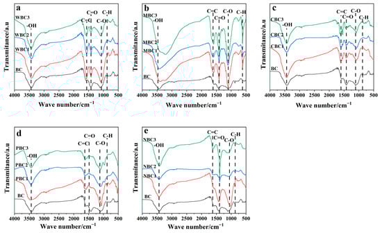 The FTIR spectra of all biochars showed a peak at 3400 cm−1 (Figure 3), which was ascribed to the vibration of alcoholic and phenolic –OH groups bonded by intermolecular hydrogen bonds [48,49]. The peaks at 1585 cm−1 and 1400 cm−1 were due to the stretching vibration of C=C and C=O, respectively [50,51]. The peaks at approximately 1158 cm−1 and 875 cm−1 were assigned to C-O and aromatic C-H, respectively [52]. Compared to BC, the peaks associated with O-H, C=O, and C-O groups in the spectra of acid-modified biochars, MBCs and WBCs in particular, were more intensive, indicating that there were more such O-containing functional groups on the surfaces of acid-modified biochars, which might be a result of hydroxylation and oxidation during acid modification [53]. The formation of these acid groups was the primary reason for the changes in the chemical properties of biochars. Liang et al. (2015) [54] found that modifying biochar with organic acid can reduce the BET specific surface area and total pore volume of biochar, and more oxygen-containing functional groups such as O-H, C=O, and C-O are formed on the surface, which is consistent with the results of WBC and MBC in this study. In addition, the C=O peak in the spectra of PBCs shifted to a higher wavenumber, and the C-H peak in the spectra of MBCs shifted to a lower wavenumber, indicating that π bonds or hydrogen bonds might have formed on the biochar surface [55].