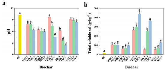 The total soluble salt content of cotton straw biochar was significantly increased by acid modification (Figure 4b). The magnitudes of increase in total soluble salt content followed the general order of CBCs > PBCs > WBCs > NBCs > MBCs. The CBCs had very high total soluble salt content, 250–437.5 g kg−1 higher than that of BC. Similarly, not only modifier type but also modifier dosage influenced the total soluble salt content of modified cotton straw biochar, which increased with increasing modifier dosage. Sahin et al. (2017) [56] found that H3PO4-modified biochar slightly increased the amount of EC, which is very similar to the results of this study. They believe that this may be due to the reaction between H3PO4 and soluble minerals such as Ca, Mg, Fe, Zn, and Mn to form insoluble phosphate. The contents of water-soluble P, K, Ca, Mg, Fe, Zn, Cu, and Mn increased significantly [56]. Some researchers believe that this may be due to the increased functional groups on the biochar surface, which provide more binding sites for cations [64,65]. Although the PBCs displayed larger pH decreases than the CBCs, they displayed smaller increases in total soluble salt content, indicating that they had smaller ion-exchange capacities.