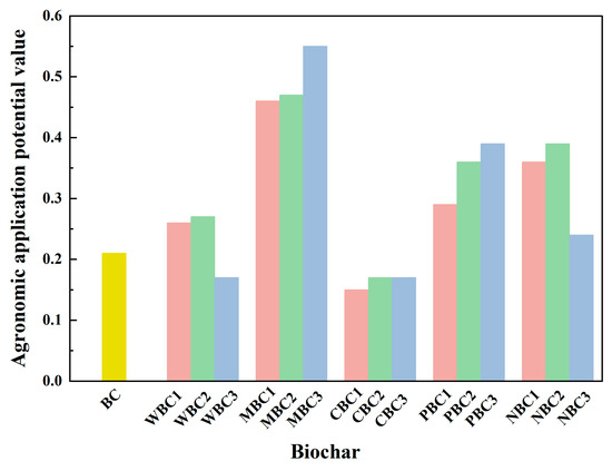 The agronomic potential evaluation using the entropy weight TOPSIS model showed that of the 15 modified biochars, CBC1–3 and WBC3 had a lower agronomic application potential than the pristine biochar. The low agronomic application potential of CBCs might be due to their high total soluble salt contents, which are not favorable for plant growth. The MBCs had the highest potential for agronomic application, and the potential of the three MBCs was in the descending order of MBC3 > MBC2 > MBC1 (Figure 5). The higher agronomic application potential of MBCs was well supported by the characterization and physicochemical analysis results presented and discussed in the previous sections.
