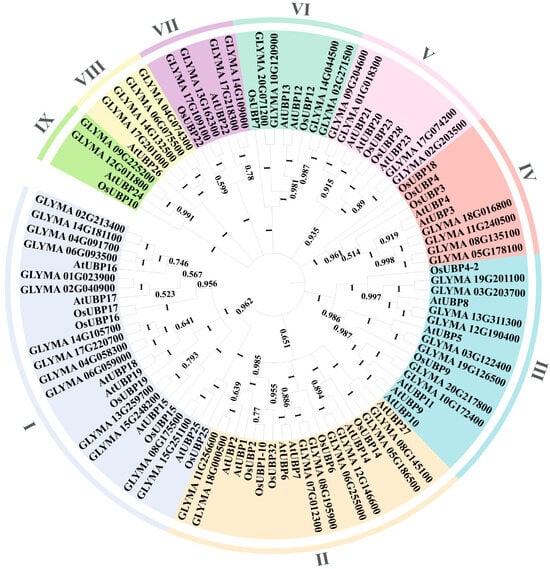 The phylogenetic tree of UBP proteins. The full-length protein sequences of the UBPs were employed to construct the phylogenetic tree using MEGA7.0 and the neighbor-joining (NJ) method. At represents A. thaliana; Os represents O. sativa; and GLYMA represents G. max. The numbers next to the branches represent the bootstrap values. Different groups of UBP proteins are distinguished by different colors.