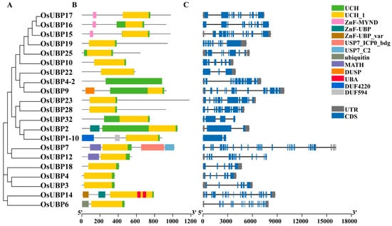 Phylogenetic classification, protein domains, and gene structures of OsUBP genes. (A) The phylogenetic tree was constructed with the full-length protein sequences of OsUBPs using MEGA7.0 and the neighbor-joining (NJ) method. (B) Distribution of conserved domains in OsUBP proteins. The scale bar at the bottom indicates the protein lengths, and different domains are shown by different colors. (C) Gene structures of the OsUBP genes. The scale bar at the bottom indicates the genomic length. Blue boxes represent exons (CDS), gray boxes represent the 5′ and 3′ untranslated regions (UTRs), and black lines represent introns.