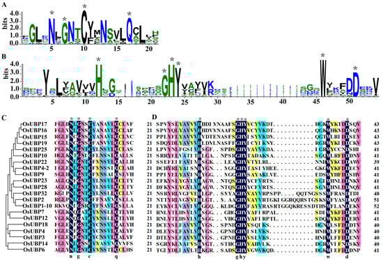 Amino acid sequences surrounding conserved amino acid residues in the Cys- and His-boxes of OsUBPs. (A) Sequence logos surrounding Cys residues in Cys-box. (B) Sequence logos surrounding His residues in the His-box. The overall height of the letter indicates the sequence conservation at that position, and the height of each letter reflects the relative frequency of the corresponding amino acid at that position. (C) Multiple sequence alignment of the amino acid sequences surrounding Cys residues in the Cys-box. (D) Multiple sequence alignment of the amino acid sequences surrounding His residues in the His-box. * represents completely conserved amino acid residues.
