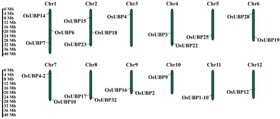 Localization of OsUBPs on rice chromosomes. The label at the top of each chromosome indicates the chromosome number. The ruler on the left represents the length of chromosome.