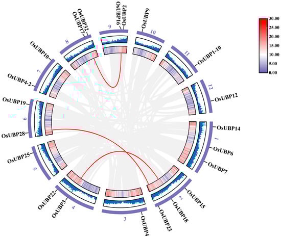 Syntenic relationships among OsUBPs in O. sativa. The chromosome numbers are distributed in the outer circle. The highlighted red lines indicate the syntenic OsUBP gene pairs. The gray lines indicate syntenic gene pairs within the rice genome. The heatmaps and line chart represent the gene density of the chromosome.