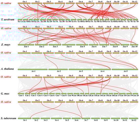 Syntenic relationships between OsUBPs and the genes in five representative plant species. The highlighted red lines indicate the syntenic gene pairs with OsUBPs. The gray lines indicate the syntenic gene pairs within rice and other plant genomes. The label next to each chromosome indicate the chromosome number.