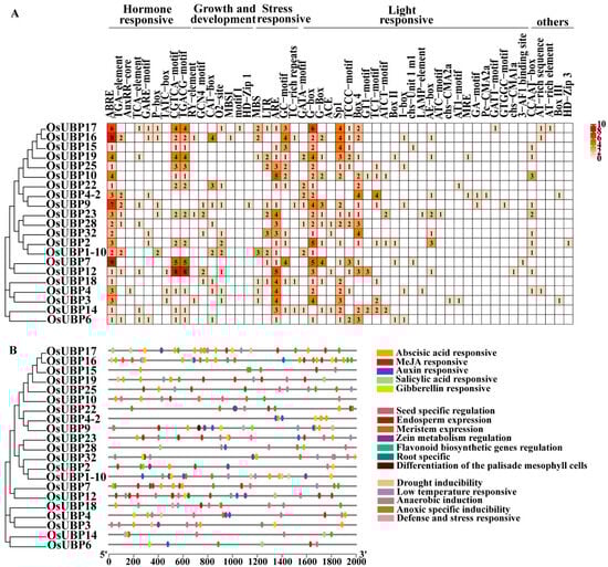 Analysis of cis-elements in OsUBP promoters. (A) The numbers and types of cis-elements in the promoters. The numbers of the grids and different colors indicate the numbers of different cis-elements. (B) The distribution of cis-elements related to hormones, growth and development, and stress. Different cis-elements are indicated by different colors.