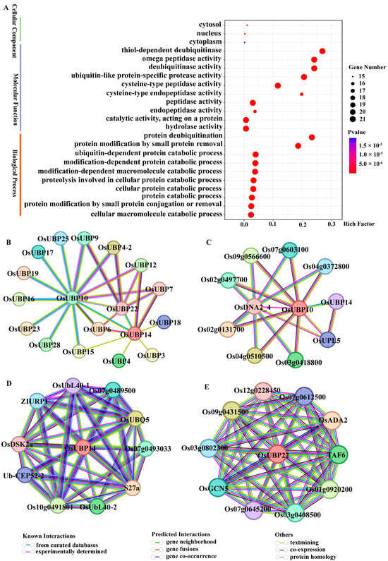 Gene ontology (GO) enrichment and protein–protein interaction analysis for OsUBPs. (A) GO annotation of OsUBPs. The labels on the left represent the GO terms and category. The size of the circle represents the gene numbers, and the color of the circle indicates the p-value of genes in GO terms. (B) Functional partners of OsUBP gene family. (C) Protein interaction network of OsUBP10. (D) Protein interaction network of OsUBP14. (E) Protein interaction network of OsUBP22. The nodes represent proteins, and the edges indicate the associations between two proteins. The types of evidence suggesting a functional link are distinguished by edges with different colors.