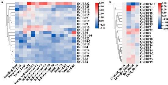 Gene expression patterns can provide clues for functional studies. To gain insight into the function of OsUBPs during rice development, the expression data of 21 OsUBPs were used to create a clustering heat map (Figure 9A). The results showed that the OsUBP genes had different expression levels in various organs and tissues. Over half of the OsUBP genes exhibited relatively low expression levels among various organs and tissues. However, it was noteworthy that the OsUBP32 gene exhibited extremely high expression levels in all locations except for young leaves and seedling roots, especially in the shoot apical meristem (SAM), inflorescence, and seeds, indicating that OsUBP32 might have an important function in the growth and development of rice. Furthermore, OsUBP6 also showed high transcription levels in dormancy and desiccation tolerance (Seed S5), as well as in young leaves. OsUBP15 and OsUBP23 were highly expressed in young leaves, the SAM, and the inflorescence, but showed low levels in other tissues and organs, indicating that OsUBP15 and OsUBP23 might be necessary for SAM and inflorescence morphogenesis due to their obvious tissue-specific features.