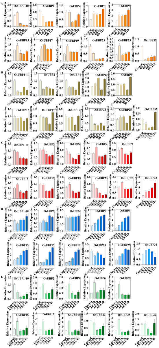 Expression levels of OsUBP genes under different abiotic stresses and hormone treatments using qRT-PCR assay with rice OsUBQ5 as a reference gene. (A) Expression profiles of OsUBP genes under drought treatment. DS: drought stress. (B) Expression profiles of OsUBP genes under 150 mM NaCl treatment. SS: salt stress. (C) Expression profiles of OsUBP genes under 40 °C treatment. HS: heat stress. (D) Expression profiles of OsUBP genes under 4 °C treatment. CS: cold stress. (E) Expression profiles of OsUBP genes under abscisic acid (ABA) treatment. Different treatments were presented by different colors. The deepening of the same color represented the increase time of treatments.