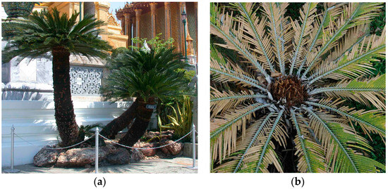 Cycas revoluta is endemic to several islands in the Ryukyu Archipelago but is cultivated in more countries than any other cycad species. The distinctive tree is often found in public landscapes of temples, churches, government buildings, and schools (Figure 1a).