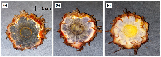 The gestalt appearance of the cut surface of Cycas revoluta stem cuttings after being stained by potassium triiodide solution. (a) Median cutting in the most stained group; (b) Median cutting in the intermediately stained group; (c) Median cutting in the least stained group.