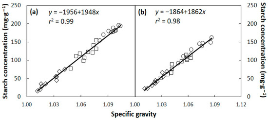 The relationship between specific gravity and starch concentration of Cycas revoluta stem cuttings for (a) pith; (b) cortex tissues. Diamonds were least stained, squares were intermediately stained, and circles were darkest stained cuttings following potassium triiodide staining of cut stem surfaces.
