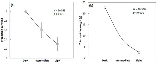 The influence of potassium triiodide stain intensity on performance of Cycas revoluta stem cuttings. (a) The proportion of cuttings that survived for 27 weeks in standard cycad propagation nursery conditions; (b) The total dry weight of new root growth per cutting. Markers are mean ± SE, n = 10.