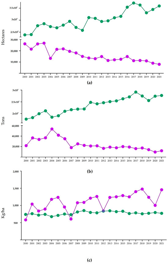Area (Ha), production (T), and yield (kg/ha) of common bean in Romania (purple) and worldwide (green) from 2000 to 2021: (a) Dry bean cultivated area in Romania and worldwide; (b) Dry bean production in Romania and worldwide; (c) Dry bean yield in Romania and worldwide.