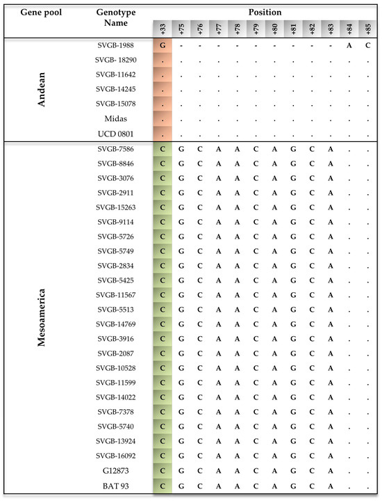 Nucleotide variant patterns, obtained after Sanger sequencing, for the 27 common bean accessions assessed in this study, from the Romanian Gene Bank’s collection, according to the PvDREB5A gene. The genotypes Midas, UCD 0801 (Andean genotypes), G12873, and BAT 93 (Mesoamerican genotypes) were provided by Konzend et al. [25]. Andean SNPs were highlighted in orange and Mesoamerican SNPs in green.