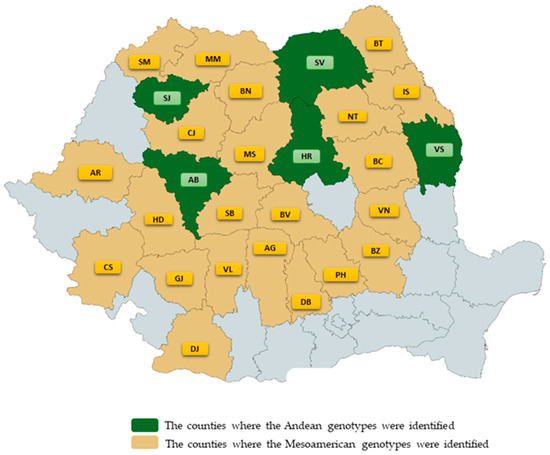 The distribution of Phaseolus vulgaris L. species on Romanian territory, originating from the Andean and Mesoamerican genetic pools. The counties’ abbreviations can be found in Table S1 in Supplementary Materials.