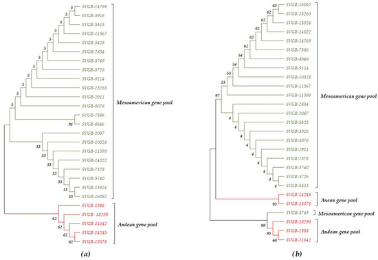 The evolutionary history dendrogram was obtained using the Neighbor Joining method and bootstrap test: (a) PvDREB5A nuclear gene; (b) PvDREB6 nuclear gene. Andean genotypes were highlighted in red and Mesoamerican genotypes in green.