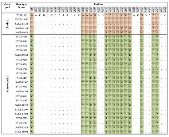 The 15 SNPs identified in the target nuclear DNA, PvDREB6B, across all studied common bean (Phaseolus vulgaris L.) accessions. Andean SNPs were highlighted in orange and Mesoamerican SNPs in green.