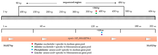 The phylogenetic tree of the 27 populations of Phaseolus vulgaris L., based on the PvDREB6B sequence, led to the separation of the accessions differently compared to the PvDREB5A sequence. Thus, according to the Neighbor Joining method, two clades were formed. The first clade produces two subclades with populations from the Mesoamerican and Andean basins. In clade 2, there are three accessions with Andean origins and a single population from the Mesoamerican gene pool. Using the Bootstrap method as a Phylogeny Test with 1000 replications, the percentage of replicate trees in which the associated taxa clustered together are shown next to the branches (Figure 5b). Ribosomal protein S4 (PvRPS4) is a coding gene from the chloroplast genome, with a position in the large single copy (LSC). The ribosomal protein genes have been included in abiotic resistance studies [41], but it has not been included, until now, in the research about the phylogeography of the Phaseolus vulgaris L. species. In the common bean, the ribosomal protein S4 gene (Gene ID: 4961741) has a low molecular weight of 606 bp, encoding a protein sequence of 201 amino acids. In the context of this survey, only a part of the ORF1, 398 bp (ORF 1 bp = Codon Start—1 bp= and Codon Stop—606 bp; ORF2 = Codon Start—345 bp and Codon Stop—256 bp) was sequenced (Figure 7).