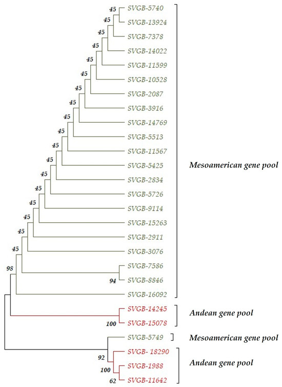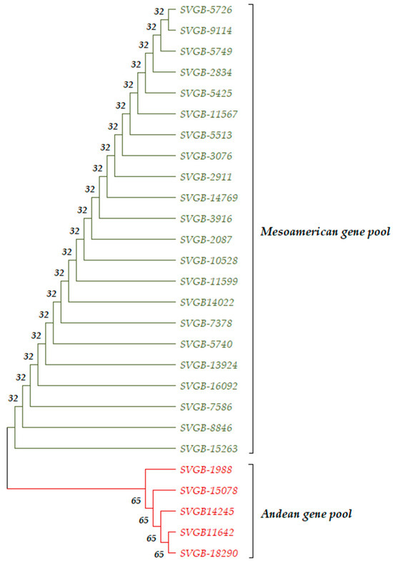 The evolutionary history dendrogram was obtained using the Neighbor Joining method and bootstrap test for the PvRPS4 sequence. Andean genotypes were highlighted in red and Mesoamerican genotypes in green.