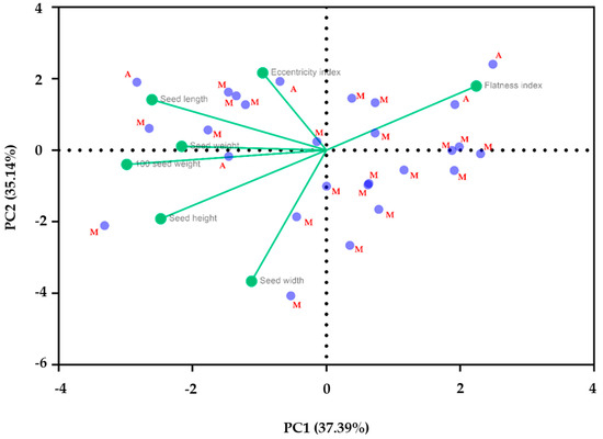 A biplot of seven characteristics (seed width, seed height, seed weight, seed length, eccentricity, and flatness index) for 27 accessions of common bean germplasm.