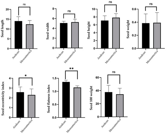 Multiple comparisons between length, width, height, weight, flatness index, eccentricity index, and 100 seed weight between Andean and Mesoamerican gene pools were obtained with the two-way ANOVA method. Where ns, * and ** represent levels of nonsignificant (p > 0.05), significant (p ≤ 0.05), and very significant, respectively.