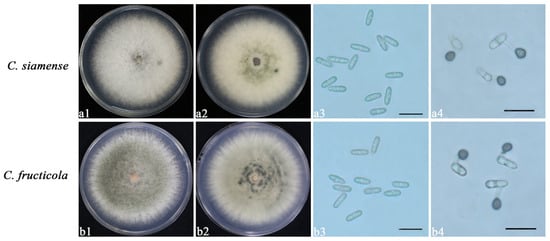 Colony morphology of of Colletotrichum siamense and C. fructicola on PDA (a1,a2,b1,b2), conidia (a3,b3), and appressoria (a4,b4); scale bar = 20 µm in (a3,b3,a4,b4).