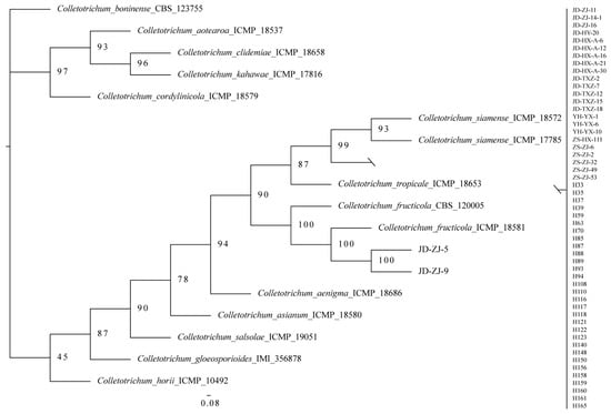 The following supporting information can be downloaded at https://www.mdpi.com/article/10.3390/agronomy13112824/s1. Table S1: Colletotrichum spp. used in multi-gene analysis in this study.