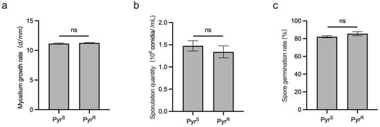 Comparison of mycelium growth rate (a), sporulation quantity (b) and spore germination rate (c) between pyraclostrobin-resistant and -sensitive strains of Colletotrichum siamense. PyrR represents the pyraclostrobin-resistant strain, PyrS represents the pyraclostrobin-sensitive strain, and “ns” means no significant difference.