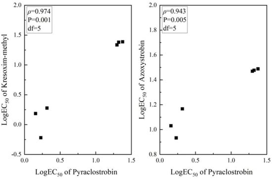 Cross−resistance between pyraclostrobin, and kresoxim−methyl and azoxystrobin. p < 0.05 indicates there is a significant difference. ρ > 0.8 indicates that there is cross-resistance. The black squares represent different strains.