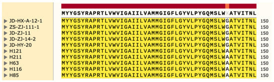Comparison of Cyt b gene sequences between pyraclostrobin-resistant and -sensitive strains of Colletotrichum siamense. JD-HX-A-12-1, ZS-ZJ-111-1, JD-ZS-11, JD-ZJ-14-2, and JD-HY-20 are pyraclostrobin-sensitive strains; H121, H211, H63, H116, and H85 are pyraclostrobin-resistant strains.