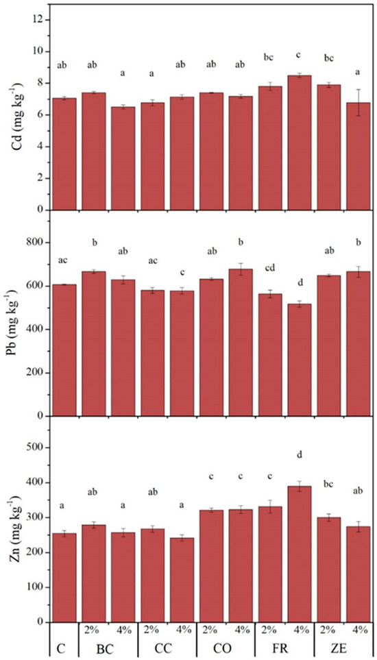 Concentration of Cd, Pb, and Zn (mg kg−1 soil) in soil extracted with DTPA in the treatments of the 5 immobilizing agents (C, unamended control; BC, biochar; CC, calcium carbonate as lime; CO, compost; FR, frass; ZE, zeolite) added in soil at 2% and 4% w/w. Different letters indicate significant differences at p < 0.05.