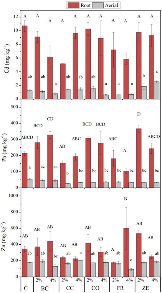 Concentration of Cd, Pb, and Zn (mg kg−1 dry weight) in the aerial parts of purslane (Portulaca oleracea) in the treatments of the 5 immobilizing agents (C, unamended control; BC, biochar; CC, calcium carbonate as lime; CO, compost; FR, frass; ZE, zeolite) added in soil at 2% and 4% w/w. Different capital letters indicate significant differences among treatments in roots at p < 0.05. Different small-case letters indicate significant differences among treatments in aerial parts at p < 0.05.