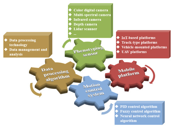 - Optimizing platform mechanisms, improving data quality, and enhancing field applicability of platforms. Design of mobile structures of platforms should be innovated to enhance the anti-vibration property and stability of platforms and improve the accuracy of data collected on complex terrains. Automatic regulating devices or modular mechanism design can be used so that platforms are adaptive to different planting systems, including the plant height, row spacing, and field layout, and can be flexibly operated in various environments and can execute tasks to acquire phenotype information about different crops.