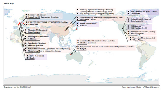 Internationally, many research institutions and commercial corporations have actively studied crop phenotypes and invested time and funds into the field to build phenotype monitoring systems, to good effect. Typical phenotyping sensors and phenotype monitoring systems as well as their research and development (R&D) institutions are displayed in Figure 3. The common physiological phenotyping sensors of crops include the single-leaf SPAD [14], Dualex [15], canopy-level ASDs (Analytical Spectral Devices) Field Spec Pro [16,17,18], CGMD-402 (Crop Growth Monitoring and Diagnosis 402) [19], and so on [20,21,22,23]. Phenotyping sensors of crop morphologies are mainly multiple types of image collectors. Based on the integration and application of hardware such as these phenotyping sensors, CropDesign in Belgium took the lead to develop a high-throughput phenotyping platform that can evaluate crop traits at large scale, namely the Trait Mill system [24,25]. The Plant Accelerator developed by the Australian Plant Phenomics Facility, a leading international research organization on plant phenotypes, is one of the most complex and expensive facilities for plant phenomics studies [26,27]. Lemna Tec in Germany developed Scanalyzer 3D and Greenhouse Scanalyzer, which is a high-throughput phenotyping platform [28,29].