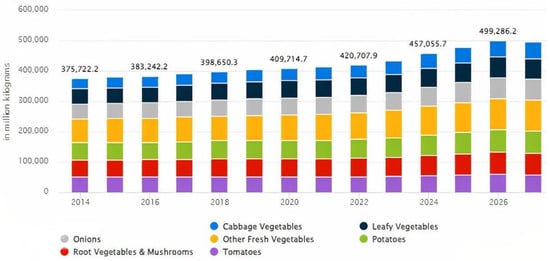 The expansion of the world’s population can be attributed to various factors, including improved healthcare, sanitation, and nutrition, leading to reduced infant and child mortality rates, thus enabling more individuals to reach reproductive age and contribute to population growth. Additionally, factors such as increased life expectancy, urbanization, and elevated migration rates have also played significant roles in this global demographic phenomenon [2]. The need for food and energy is rising correspondingly, and thus the agri-food sector and food production are growing to provide food security for all populations. Figure 1 represents the worldwide vegetable production volumes in million kilograms in 2014–2026; the graph shows clearly the increase in production over the years with an estimation for more increase. As the future demand for food is expected to be higher, larger areas of crop cultivation and yields will increase as well [3].