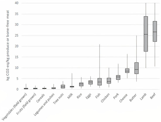 Water, food, and energy are interlinked focal points for promoting sustainable development, with increasing demands for each of them. However, food production significantly contributes to environmental pollution through its various stages, from production to marketing. In 2015, food production emissions accounted for 34% of the total greenhouse gas (GHG) emissions globally, reaching 18 Gt CO2eq per year [7]. Animal products’ production, including animal feed production, represents 29% of the water footprint of the worldwide agricultural sector, and it occupies 80% of all agricultural land. Figure 2 represents CO2 emissions for selected broad food categories, with meat products having the highest emissions. Agriculture also leads to species loss, habitat loss, and ocean and freshwater eutrophication. The impact of food production on the environment is substantial, and it is imperative to address it to meet our climate targets [8,9,10].