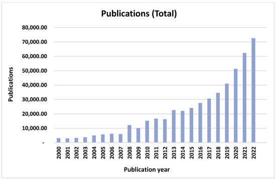 It is worth highlighting the growing attention towards biomass conversion technologies and their practical uses. A striking illustration of this trend is the substantial number of publications, nearly 494,922 in total between 2003 and 2022, as depicted in Figure 4. In 2003, there were approximately 4035 publications, whereas, by 2022, this figure had surged to 71,222 publications, marking a remarkable increase of about 1664.8%. This data underscores the escalating interest in this field, which holds particular relevance for Lebanon. The country is grappling with significant challenges in both clean energy production and waste management. The review aims to promote green solutions for these challenges and generate interest in the application of biomass conversion technologies, such as pyrolysis, for sustainable practices in Lebanon and beyond.