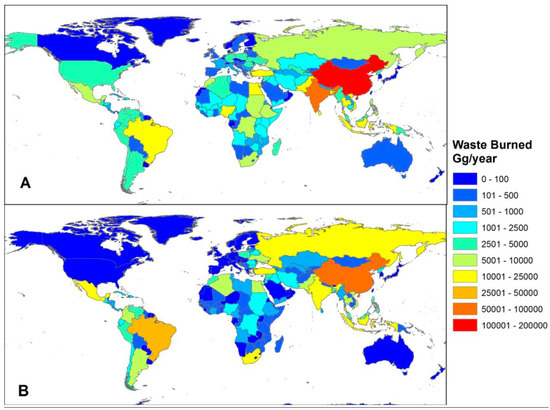 Estimated quantity of waste burned by country, residentially (A) and in dumps (B) Reprinted with permission from Ref. [24]. Copyright 2014, American Chemical Society.