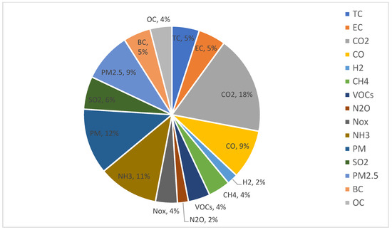 The presence of landfills gives rise to environmental concerns, primarily because they can lead to the contamination of surface and groundwater through leachate. Additionally, landfills generate greenhouse gas emissions during the decomposition of organic waste, which poses risks to air quality, human well-being, and plays a role in exacerbating climate change. Nevertheless, biomass has served as a fuel source for centuries, and while its combustion can result in the emission of pollutants, notably greenhouse gases, with CO2 being the predominant component (as illustrated in Figure 6), there exists the potential for its transformation into biofuels via thermochemical methods. These processes present a more environmentally sustainable substitute for fossil fuels [25,26,27,28].