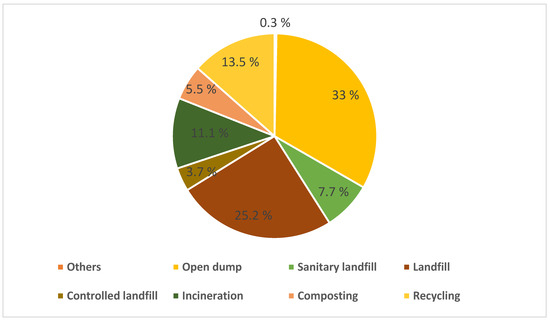 Composting comprises only 5.5% of the total waste treatment methods used globally, while open dumping comprises the largest share, of 33% (Figure 7) [67].